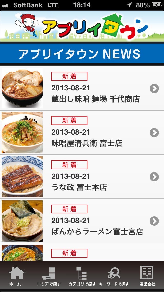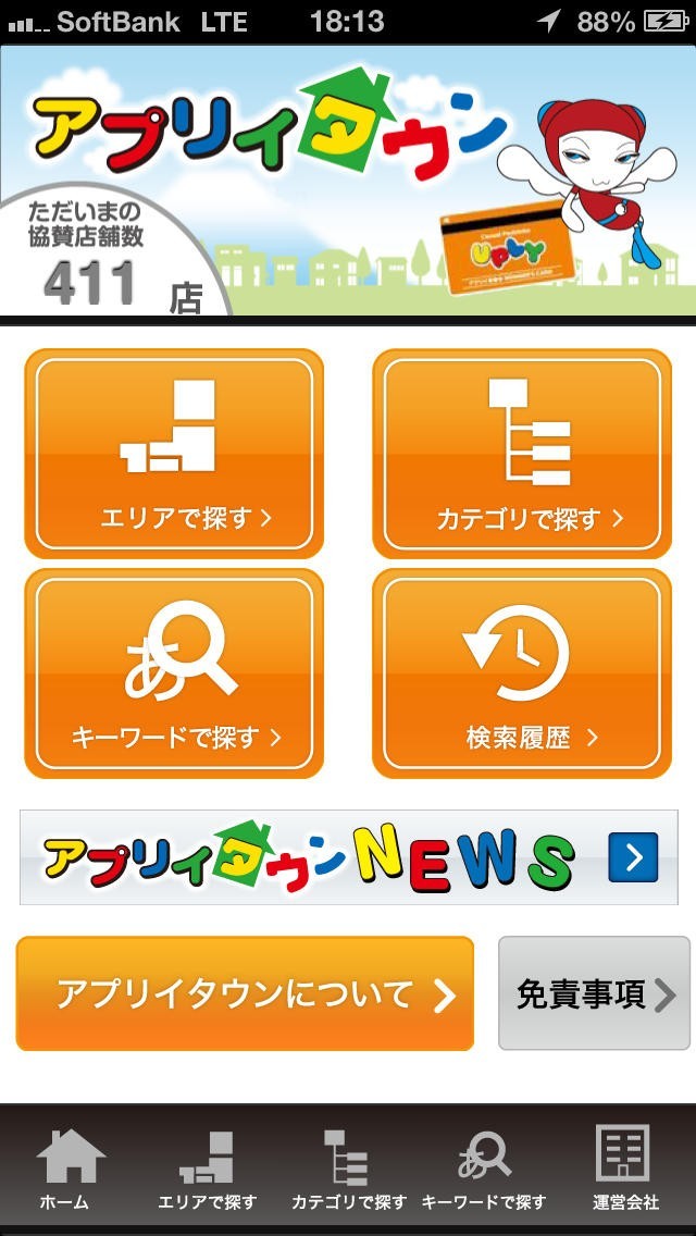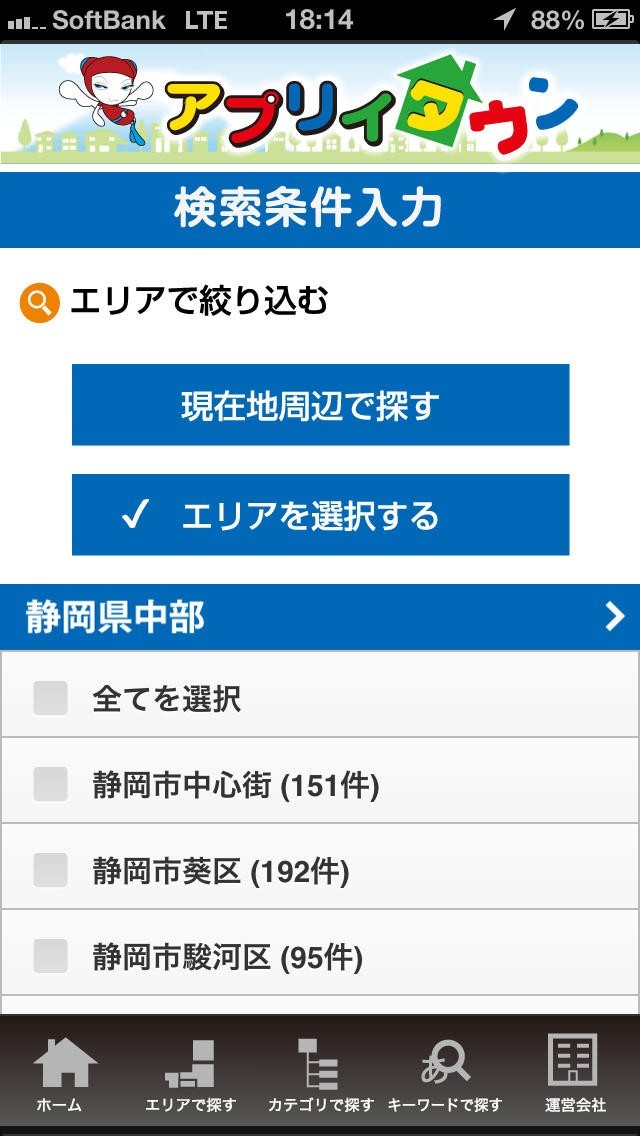 「アプリイタウン」は、クーポンサービス「アプリイカード」に協賛している静岡県内280以上の飲食、美容・健康、娯楽、宿泊関連などのお店を検索できるアプリです。検索方法は、エリア・カテゴリ・キーワードの3つから選ぶことができます。検索結果はサムネイル画像付きでリスト表示され、店舗名をタップすると、連絡先・お店の詳しい説明・アプリイカードを提示したときの特典内容・営業時間などを確認できる他、MAPボタンをタップすれば外部アプリで所在地のマップを開くことができます。また新着の協賛店舗情報がチェックできるアプリイタウンNEWSや検索履歴などの機能も搭載されています。