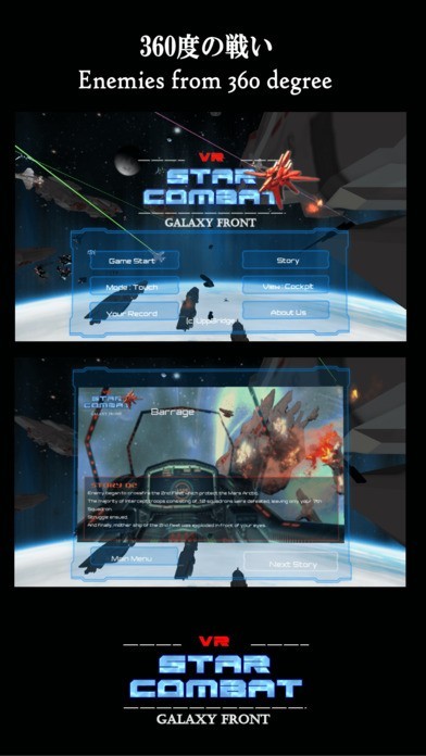 HMDにスマホを装着すれば、最先端のVR機能を利用して、戦闘機パイロットを体験できます。舞台は壮大なスケールの宇宙空間です。侵略してくる敵の戦闘機部隊を阻止するのはエースパイロットのあなたです。