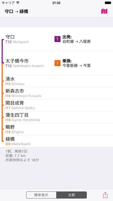 初めて訪問する旅行者でも安心!駅ごとに乗り換え路線も表示