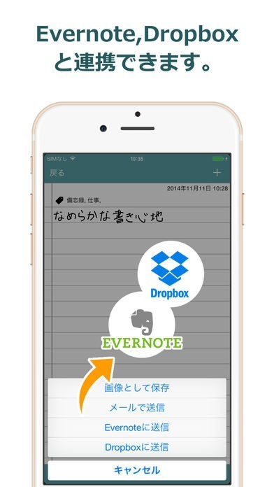手書きメモ帳 Touch Notes シンプルで使いやすい手書きノートアプリは指やタッチペンでスマートフォンの画面をなぞるようにしてメモを取ることの出来るアプリです。メモのペンは45色から選択することができ、先の太さは4種類用意されています。書いたメモはタグを付けて分類できるため、用事のメモ、料理のメモ、電話のメモなどといった区分ができて便利です。なお、メモはEvernoteやDropboxへの送信、メールへの添付などが可能です。