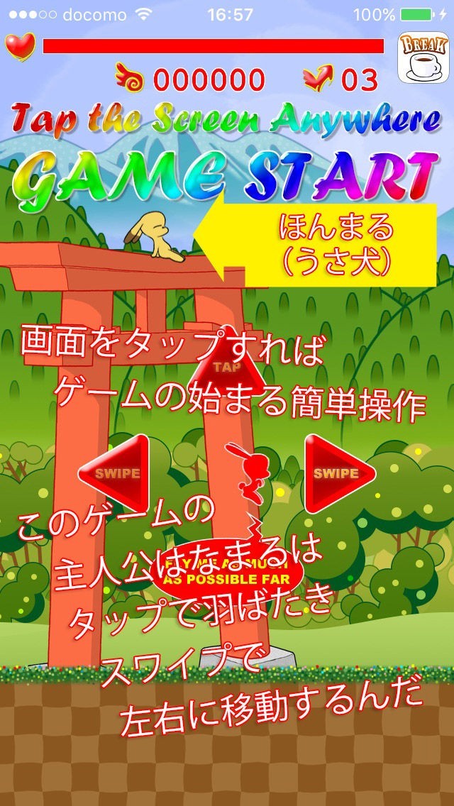 App Storeより引用このゲームの主人公ほんまるをできるだけ遠くまで飛ばしましょう。うさ犬のほんまるは耳を羽ばたかせて空を飛べます。地面につかないまま出来るだけ遠くまで飛ばすと高得点が得られます。地面に着地すればゲームオーバーです。