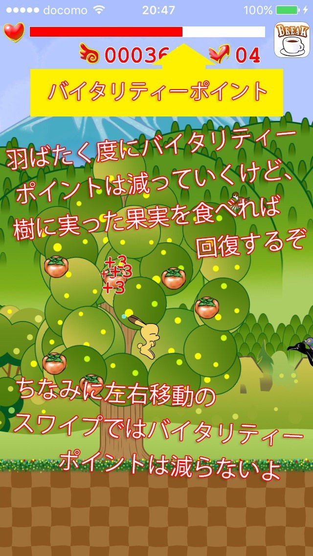 タップするとはなまるは羽ばたき一定量上に浮かびます。右スワイプでは瞬発的に前進し、左スワイプでは後退します。タップ操作はバイタリティーポイントを1ポイント消費しますが、スワイプ操作ではバイタリティーポイントは減りません。