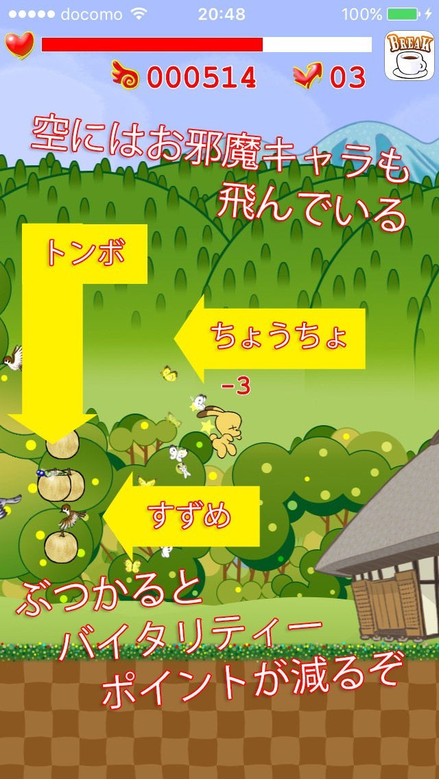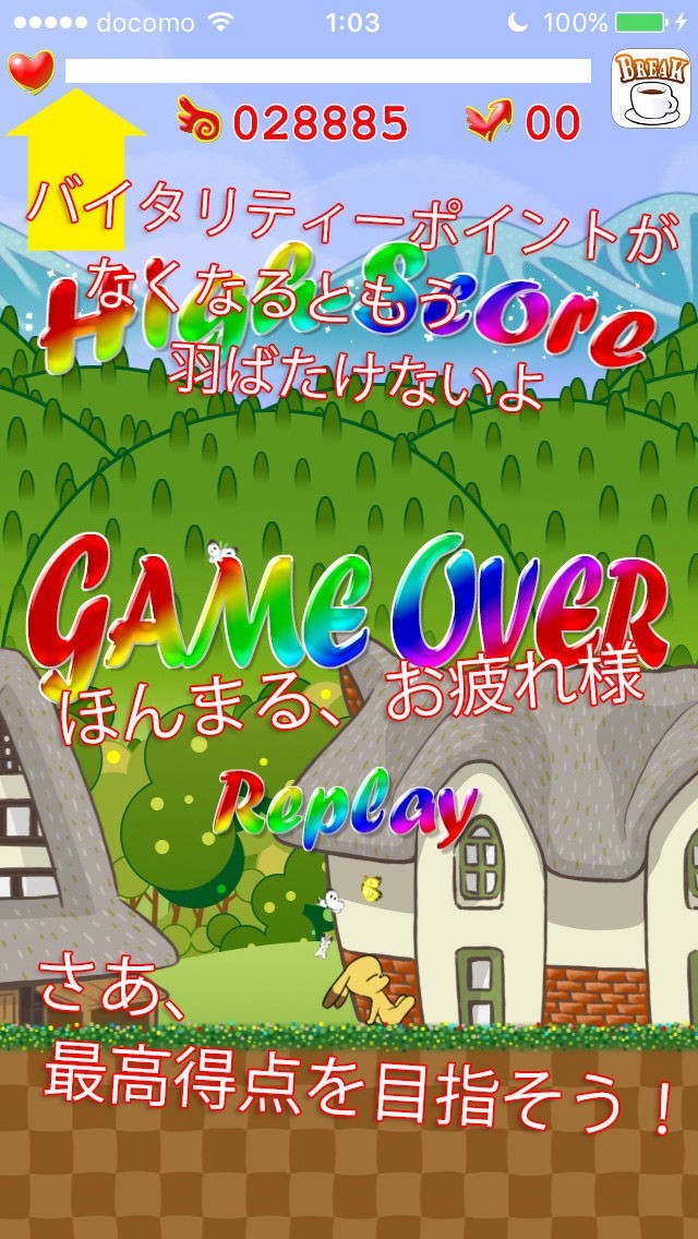 ほんまるは画面上の赤い帯で示されるバイタリティーポイントが続く限り羽ばたけます。途中お邪魔キャラにぶつかればバイタリティーポイントは減ります。また途中にはバイタリティーポイントを回復されるアイテムもあります。