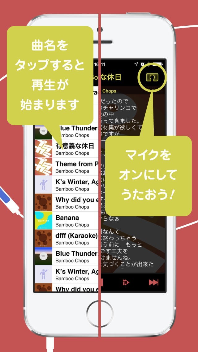 3.曲目リストで好きな曲をタップすると演奏が始まり、設定されている場合は歌詞が表示されます。