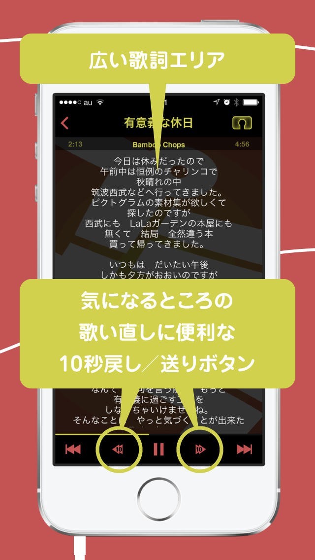 • 自分の声と再生中の曲がミックスされて聴こえるので、客観的に自分の歌をジャッジできます。