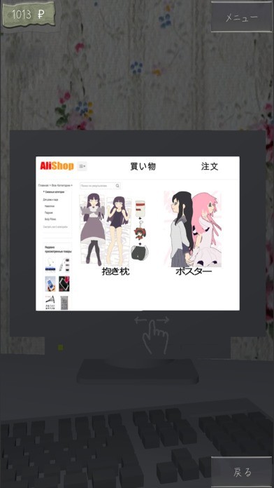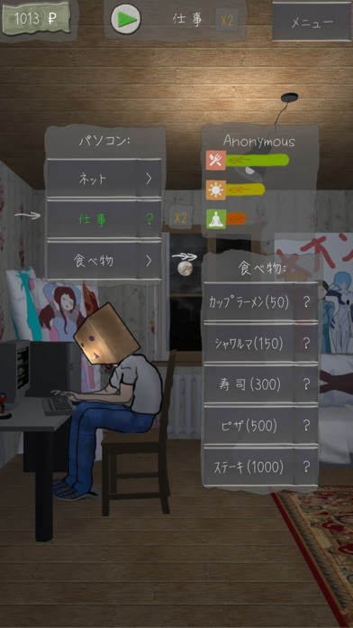 主人公には3つのステータスがあり、ネットサーフィンをしたりゴロゴロしたりすることによって、それぞれの値に影響が生じます。仕事をすればポイントが貯まり、買い物もできます。