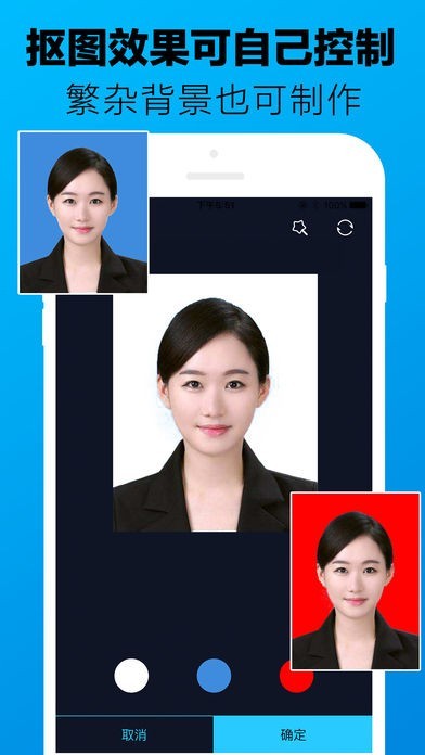 着ている物や提出場所によってバック色の指定がある場合も簡単に色を足せます。標準の白だけでなく青なども利用でき、顔の印象や職種など受ける試験に合わせ変換できます。