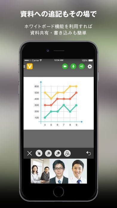 PC画面の共有を行うことができます。会議用の資料をPCに表示して、画面の共有が可能。さらに書き込みなどもその場で行えるため、判りやすく資料を表示しつつビデオ会議を進めることができます。