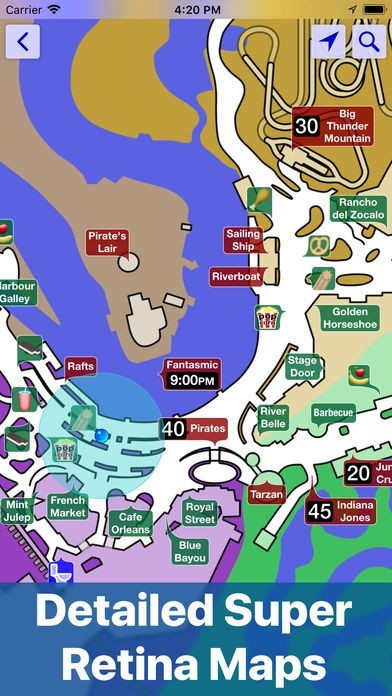 高性能のマップはズームアウトするとパークの全体像を把握でき、ズームインしてピンをタップすれば待ち時間やショーの時間が分かるので、効率よくパークをまわれます。現在地はGPSで表示されるので広いパーク内でも迷いません。