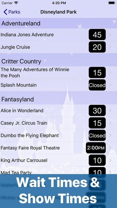 限られた時間で少しでもたくさんのアトラクションをまわりたいですよね?エリアごとの待ち時間とショーの開始時間が一覧で見られるので、待ち時間の少ないアトラクションを選べばショーの開始までにもう一つ楽しめるかもしれません。