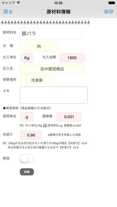 レシピ原価計算が簡単に行えるのがこのアプリ最大の利点だと思います。意外と売価を決めるのには時間もかかってしまうものですが、このアプリではそういった部分の大きな手助けになります。