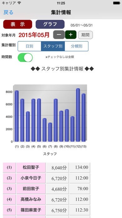 集計情報画面では月間や指定期間で勤怠金額、勤怠時間の一覧を表示したり、グラフ化されることで、勤怠の管理について分析することや、実働状況などを把握しやすくなります。