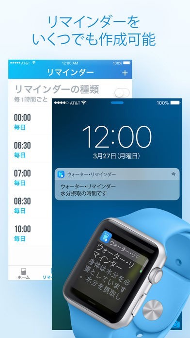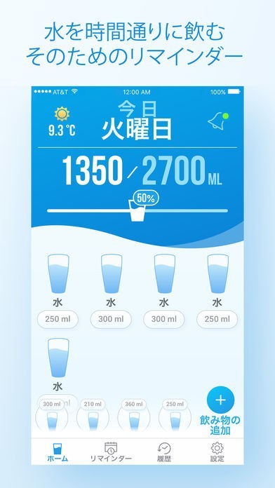 水を時間通りに飲むためのリマインダーアプリです。体に必要な水の量を計算したり実際に摂取した水分の量を記録したりすることができます。自分に合った通知方法で体を改善するのに役立ちます。