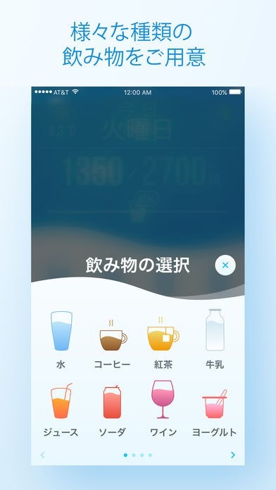 水はもちろん、コーヒーや紅茶、ワインなど様々な種類の飲み物の飲む量を記録することができます。カフェインやアルコールの摂取量を気にする人にオススメです。摂取する飲み物の量は簡単に調節できます。