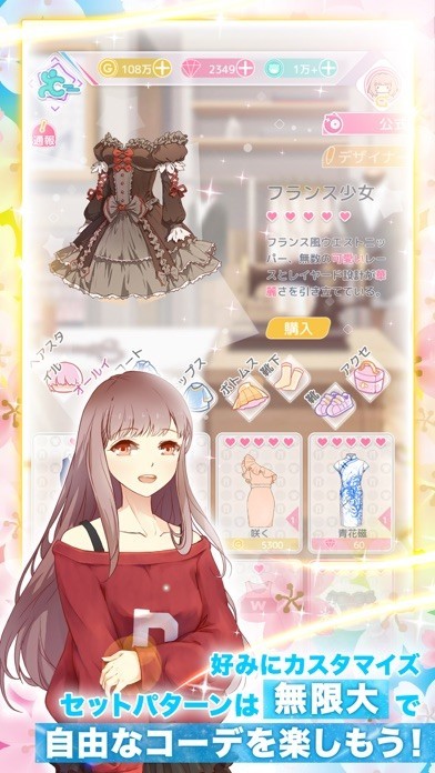 ドレスだけではなく、アクセサリーやバッグ、帽子や背景テーマなど、数多くの着せ替えを楽しめます。