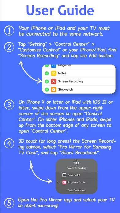 Pro Mirror app can mirror your iPhone or iPad screen to your Samsung Smart TV. To use the app, simply connect your iPhone/iPad and your TV to the same network. The app is suitable for watching movies, listening to music, watching photos, giving presentations, and much more!