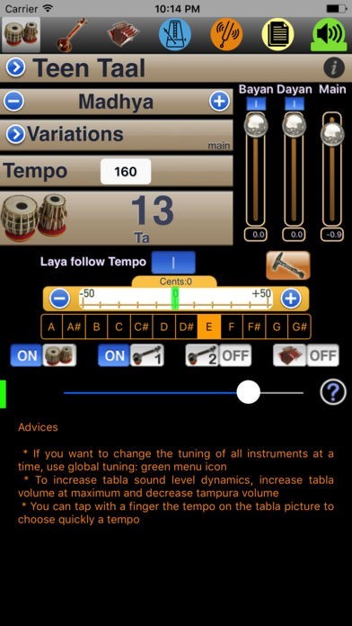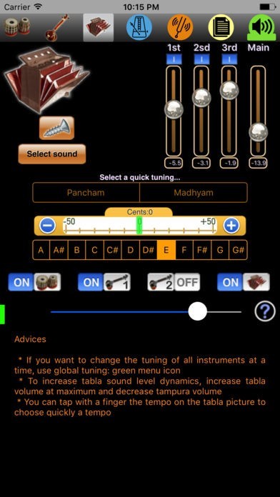 Several high quality and perfectly tuned tampura sound samples are provided within iTabla Pandit. You can use them in ANY PITCH by changing the key. How to change the sound? Just select your new sound in the list and the instrument will play with this sound.
