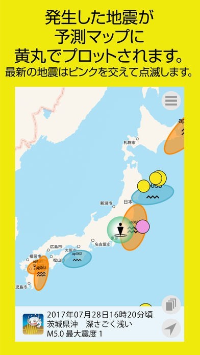 地震がこれから起こりそうなとき、予測マップに発生源が表示されます。どこでどんな規模の地震が発生するのか、ひと目で分かります。住んでいる地域の近くで予測が出たら、地震対策をしておきましょう。