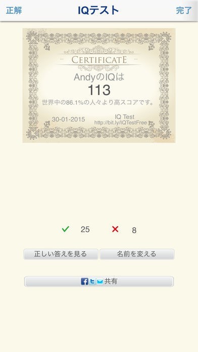 15~30分で受けられ、テスト終了後にはあなたのIQ指数と世界ランキングが書かれた証明書が発行されます。その結果をSNSで友達にシェアも可能。みんなでワイワイ盛り上がりましょう!