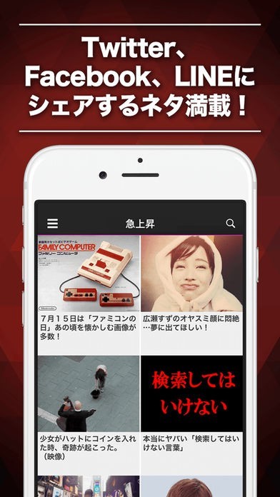 一日に20記事を紹介する厳選されたニュースや衝撃映像や笑いたくなるような面白いネタや凄い技や芸能ゴシップなどなど満載の情報が目白押しです。使いやすいスワイプ操作でサクサク操作、ついついシェアしたくなるようなネタがあればその場ですぐTwitterやFacebookなどにアップして、いいねをもらって楽しめるアプリです。