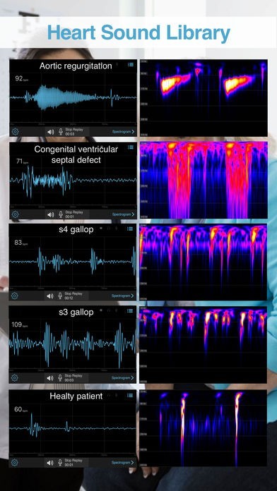 There is a list of previously recorded hearth sounds that you can play, listen and visualize using the spectrogram and time domain graphical interface. Improve your knowledge and skill at identifying various conditions.