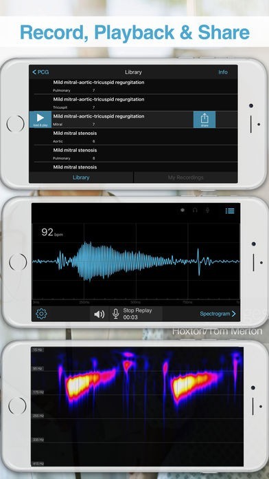 You can also visualize your own heart waveform. You can record, playback and share your own sound files with your friends.