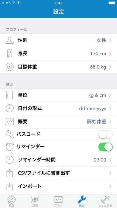 デリケートな情報だからこそ、誰にも見られたくないですよね。当アプリはパスコードロック付きで安心して体重管理ができます。また、Eメール経由でCSVファイルとして体重データを書き出すことができ便利です。