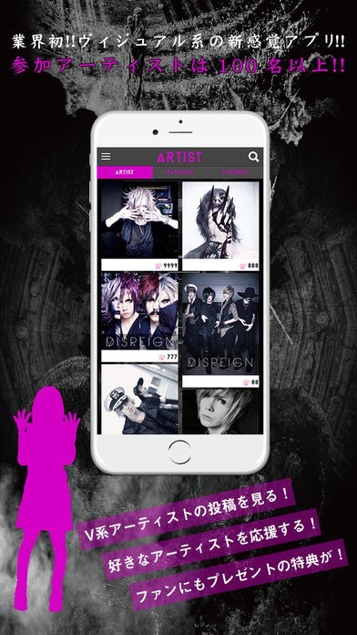 ヴィジュアル系に特化したバンド応援アプリです。応援されることでアプリ内のランキングが変化していきます。上位になったバンドにはイベント出演など様々なご褒美があります。あなたの力でバンドを応援していきましょう。