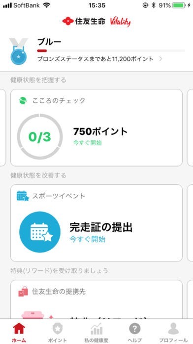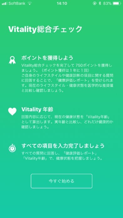 「Vitality」は、住友生命の健康増進型保険のユーザー専用アプリです。 ジムや自宅での運動、スポーツイベントへの参加といった取り組みを登録可能。 登録された運動はポイント化され、貯めたポイントで特典を獲得できるようになっています。 オンラインチェック機能を搭載しており、健康年齢と実年齢の差を手軽にチェックできる他、食生活や心の状況についても確認することができます。