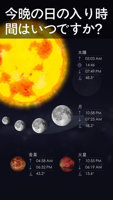 「Star Walk 2 - 空 マップ: 星や星座」は、上空の星や星座がその場でわかるアプリです。これまでにあったような星座確認のみの機能ではなく、対象となる星の説明やISS(国際宇宙ステーション)の位置まで確認できます。天体のリアルなグラフィックにも特徴があり、自身の興味以外に子どもたちの学習用としても活用可能です。また、日の出日の入りのほか、月や金星などが見える時間帯も確認できます。