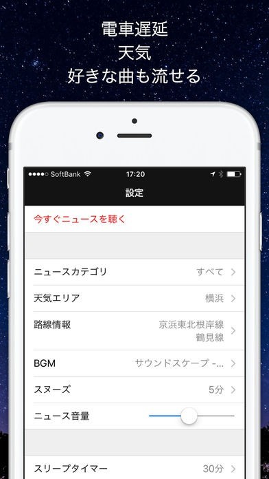 好きな曲をBGMに、時刻や電車遅延情報、天気も読み上げるラジオ風のアラームで、毎朝スッキリ起きれます。