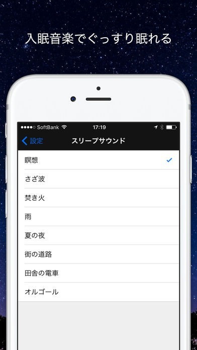 ・スリープタイマー(さざ波・焚き火・雨・夏の夜・瞑想・オルゴール・街の道路・田舎の電車の8種類の入眠音楽)
