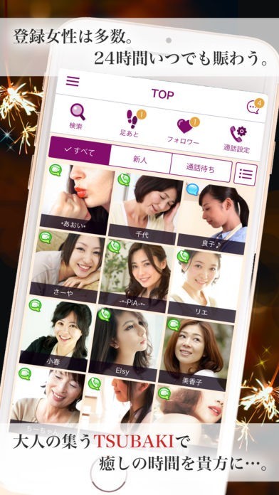「TSUBAKI」は、大人な女性が多数登録している通話アプリです。顔写真がずらっと掲載されており、自分の好きな女性を選んでアプローチすることができます。個人情報をさらすことなくやり取りを始められるのも大人から好まれている理由の一つです。チャットを始めて仲良くなれば相手の顔を見ながら通話をすることもできるかもしれません。