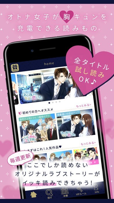 複数の作品がまとまっているアプリは珍しくありませんが、特徴はストーリーが多数収録されているうえに毎月追加される点です。例えば1話完結だけでなく6話構成もありますので、一気読みでも楽しめますが少しずつ読んでみるのも良いでしょう。毎日の楽しみと位置づけることにより、リアルでイヤなことがあった、恋に飢えている、なんてときに心の穴埋めとしても活用できます。