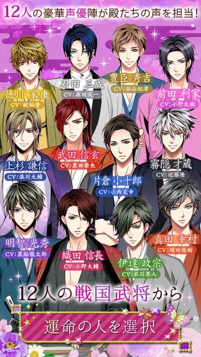 徳川家康や明智光秀など、誰もが知っている最強戦国武将12人の中から好みのキャラクターを選んで恋愛を楽しみましょう。自分の選ぶセリフによって進展は違います。同じキャラクターでも何度も楽しめます。