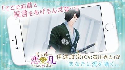 このアプリでは。ゲームアプリ「天下統一恋の乱 Love Ballad」の登場キャラクター「伊達政宗」と甘い結婚式を体験することができます。さまざまなシュチュエーションに身も心も甘く溶けてしまう事は間違いありません。