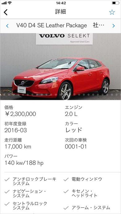 App Storeより引用「VOLVO SELEKT APPROVED CAR」は、新車登録より6年未満および走行距離60,000km以内の車両の中からさらに、専門スタッフによる厳しいチェックのもと、内外装・機関において一定の基準をクリアしたボルボ認定中古車のことです。