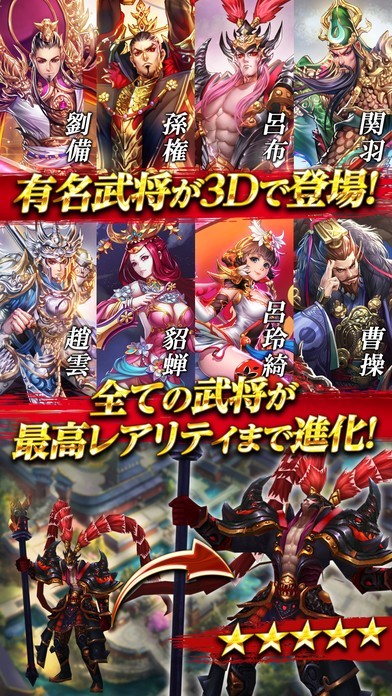 このゲームはフル3Dによるド派手なアクションを楽しむことができます。登場するのは三国志に関連する有名な武将たちで、それぞれ特徴的な外見をして見た目でも楽しむことが出来ますし、スキルなどの特徴でもそれぞれ楽しむことが出来ます。 操作については、自分ですべて動かすことをオススメしますが、完全オートプレイも、スキルだけ動かすことが出来る設定もすることが出来ます。 また、最大で38人もの人たちが一緒に戦うことが出来る共闘バトルを楽しむことも出来ます。