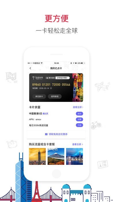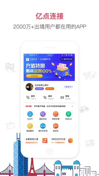 新用户首次下载注册,可立即领取亿点全球上网卡1张(还包邮)、全球通话时长300分钟及188元新人出行大礼包!