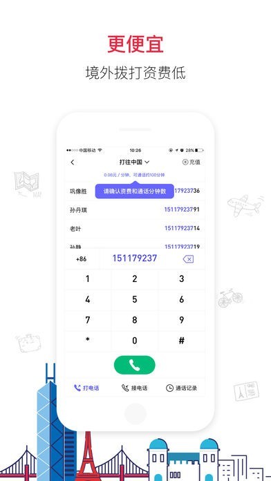 拨打超低价,支持225+目的地原号码一键拨打,免费接听;