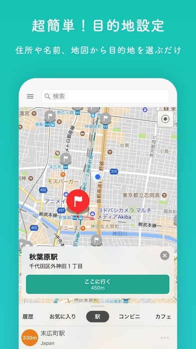 目的地設定機能で目的地までの距離と方角を自動表示!ふらりと散策をしたい時にはおすすめスポット検索機能が活躍!