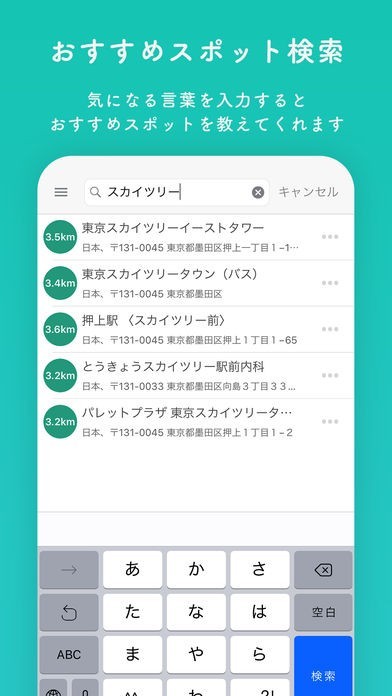 累計100万ダウンロードを達成したナビアプリ「Waaaaay!」では、方向音痴さんを手助けしてくれる目的地設定機能を用意しています。住所や名称から目的地を選んで設定したら、あとはアプリが自動的に目的地までの距離と方角を表示してくれるのが便利なポイント。地図からの目的地設定も行えるため、住所や名称が判らなくても利用することができるでしょう。目的地までの方角を示す矢印機能も搭載されており、ユニークなサンマ型矢印も使用可能。また、おすすめスポット検索機能では、気になるワードを入力するだけでおすすめスポットを絞り込んでくれるため、ふらりと散策をしたい時にも活躍してくれます。