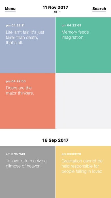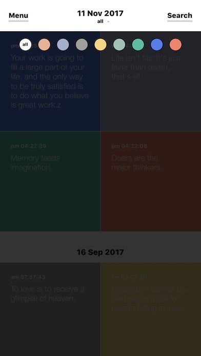 「Memory」はお手軽操作で即テキストメモができるメモアプリです。全てのメモの背景色を8種類の色から選んで設定できます。緊急用のメモを特定の色に設定するなど工夫次第で使い方の幅が広がりますよ。