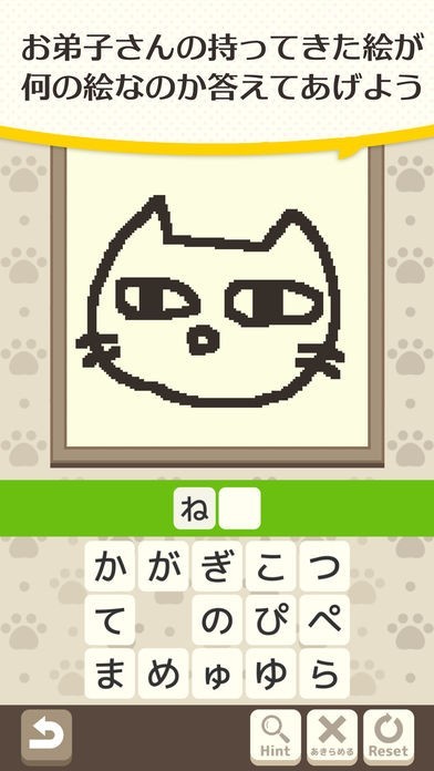 ネコのお弟子さんが持ってくるお題は何か、お友達と一緒に当てて遊びましょう。たくさん解答すると「ひらめき」が溜まり、ひらめきが溜まると自分がお題に沿って絵を描けるようになります。