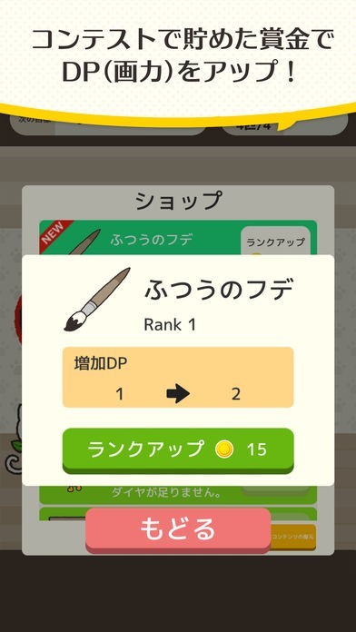 自分が描いた絵をコンテストに出店し、ランキングを競うことができます。全国の絵描きさんが絵を評価し、賞をもらうとコインが溜まります。コインを溜めてアイテムを強化しよう。