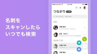 人工知能を利用した名刺管理アプリです。カメラで名刺を撮影すると自動でデータ化されます。最大で7枚の名刺を同時に読み取ることができるので、一枚一枚撮影する手間が省けます。アプリを使うほど人工知能が学習して読み取り精度が上がっていきます。名刺のデータにメモを付け加えられるので相手のより詳しい情報を記録しておけます。 名前だけでなく会社名や役職でも検索ができるので、名前が思い出せなくても安心です。登録した名刺の相手にワンタップで電話をかけたりメール送信ができます。
