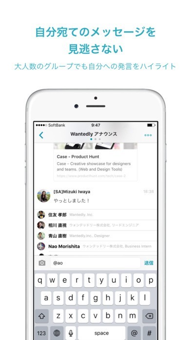 月間100万人以上のユーザーが愛用するビジネスチャットツール「Wantedly Chat」 複数のメンバーが参加するプロジェクト管理にも活躍してくれるツールとして、グループでのチャット機能なども搭載しています。 個別にメッセージを送信したい場合にはメンション機能からメンバーをタップで選択。 大人数のチャットでも個別メッセージならば埋もれることなく、きちんと相手に届けることができるでしょう。 また、便利なファイル機能も充実。ワード、エクセルなどのビジネスシーンで利用頻度の高いoffice形式のファイルも共有できます。