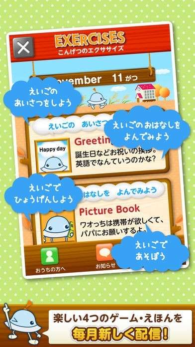 毎月「挨拶・会話」「文法・常識」「ゲーム」「絵本」の4つをピックアップして無料配信!