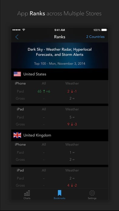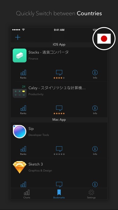 • Check top charts of iPhone, iPad, Mac AppStore across different countries easily.