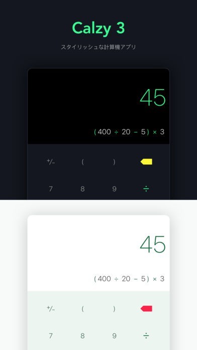 「Calzy 3」は、多機能で使いやすい電卓アプリです。 ベーシックモードでは足し算や引き算、掛け算などの基本的な計算に加えて、税金計算や通貨の四捨五入なども可能。 独自のメモリーエリアが用意されており、計算や数値を保存しておいて再利用できるのが特徴です。 カラーカスタマイズも搭載し、お好みでダークモードやライトモードへの切り替えが行えます。